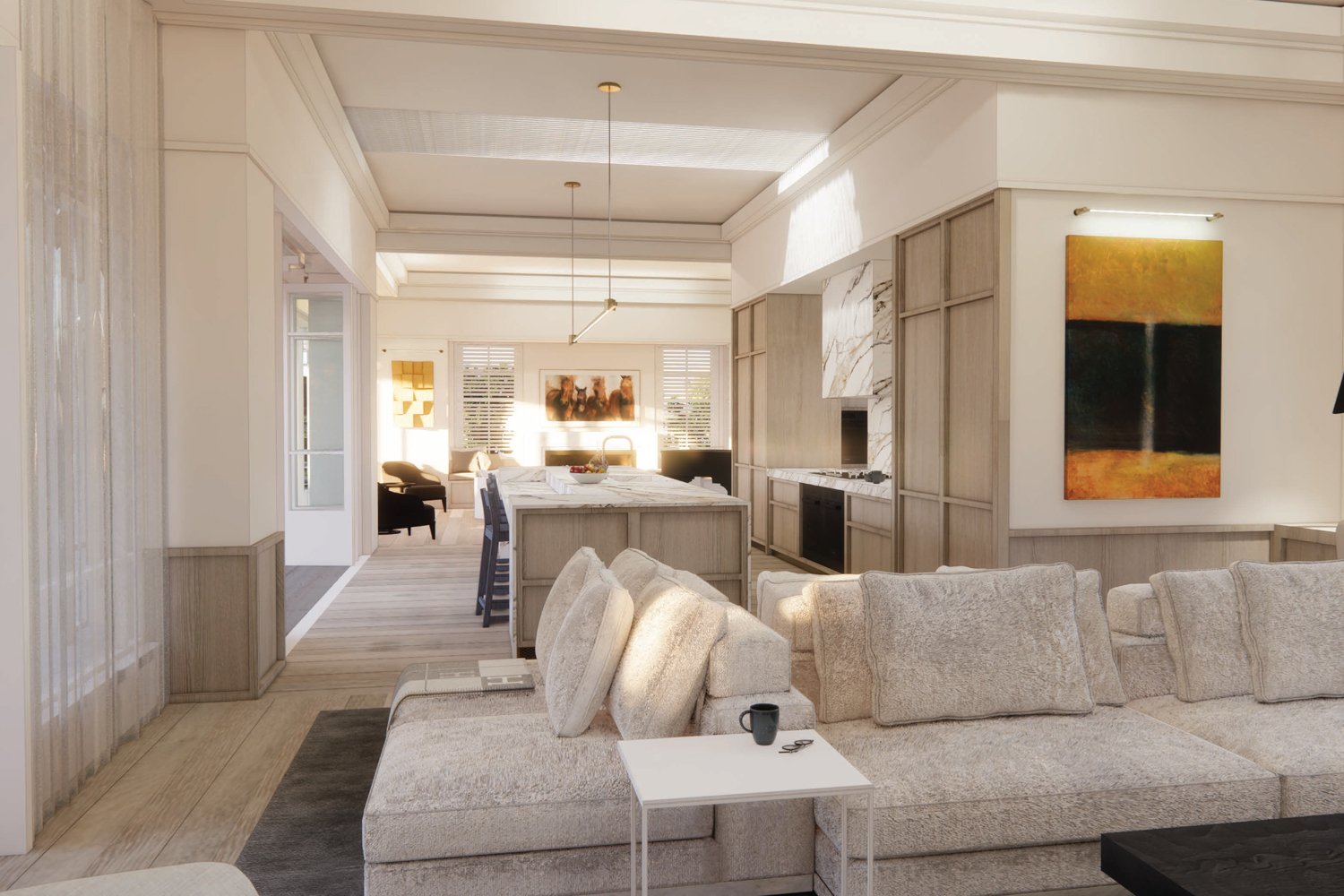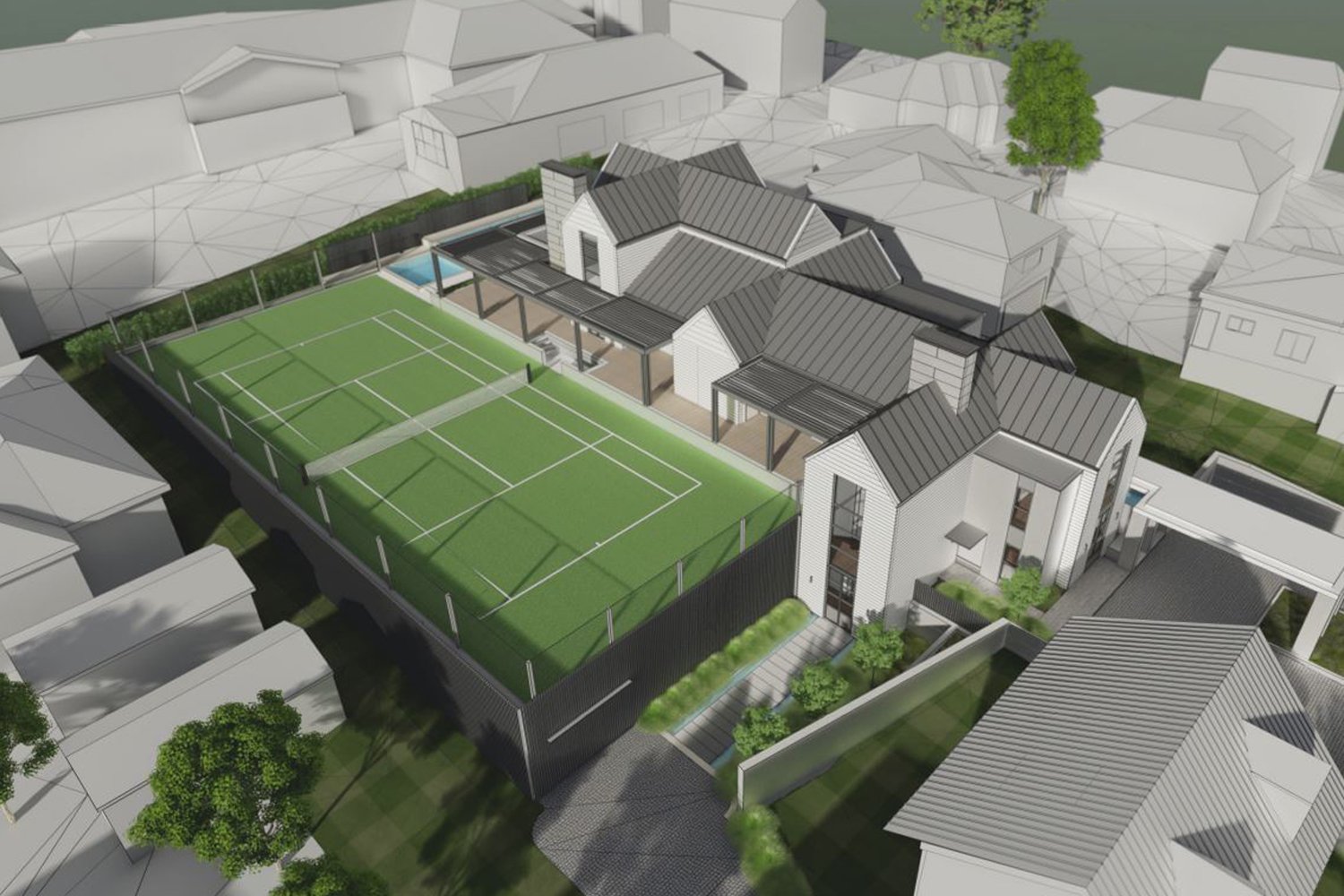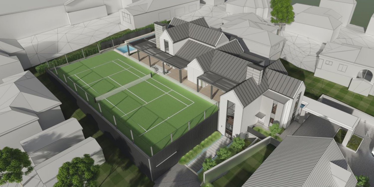 Completion Date 2024 The 3-storey house is located across 3 sites and includes a tennis court with underground parking. The brief required the house to follow a cape cod architectural style.